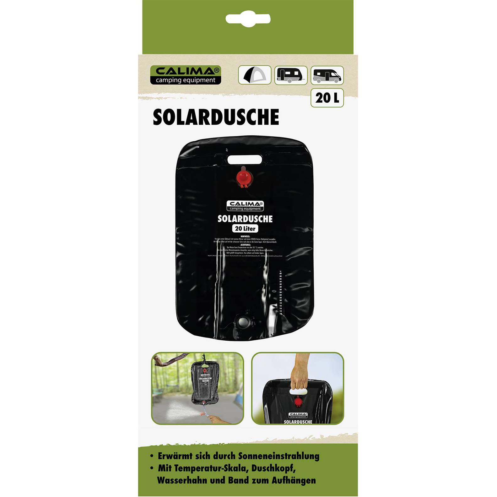 Die Calima Camping Dusche ist die perfekte Lösung für erfrischende Duschen im Freien. Mit ihrem integrierten 20l Kanister und den kompakten Abmessungen (B x H: 39.5 cm x 59 cm) ist sie leicht zu transportieren und einfach zu verwenden. Der strapazierfähige PVC-Material sorgt dafür, dass die Dusche langlebig und robust ist, während die Sonneneinstrahlung das Wasser angenehm erwärmt. Ausgestattet mit einer praktischen Temperaturskala, einem Duschkopf, einem Wasserhahn und einem Aufhängeband ist sie ideal für Campingausflüge oder den Einsatz im Garten.