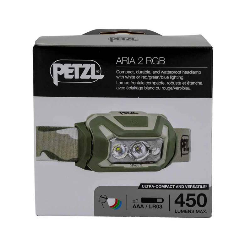Eigenschaften "Petzl Aria 2 RGB - Stirnband-Taschenlampe (Braun, Camouflage, Duraluminium, Gummi, Tasten)"